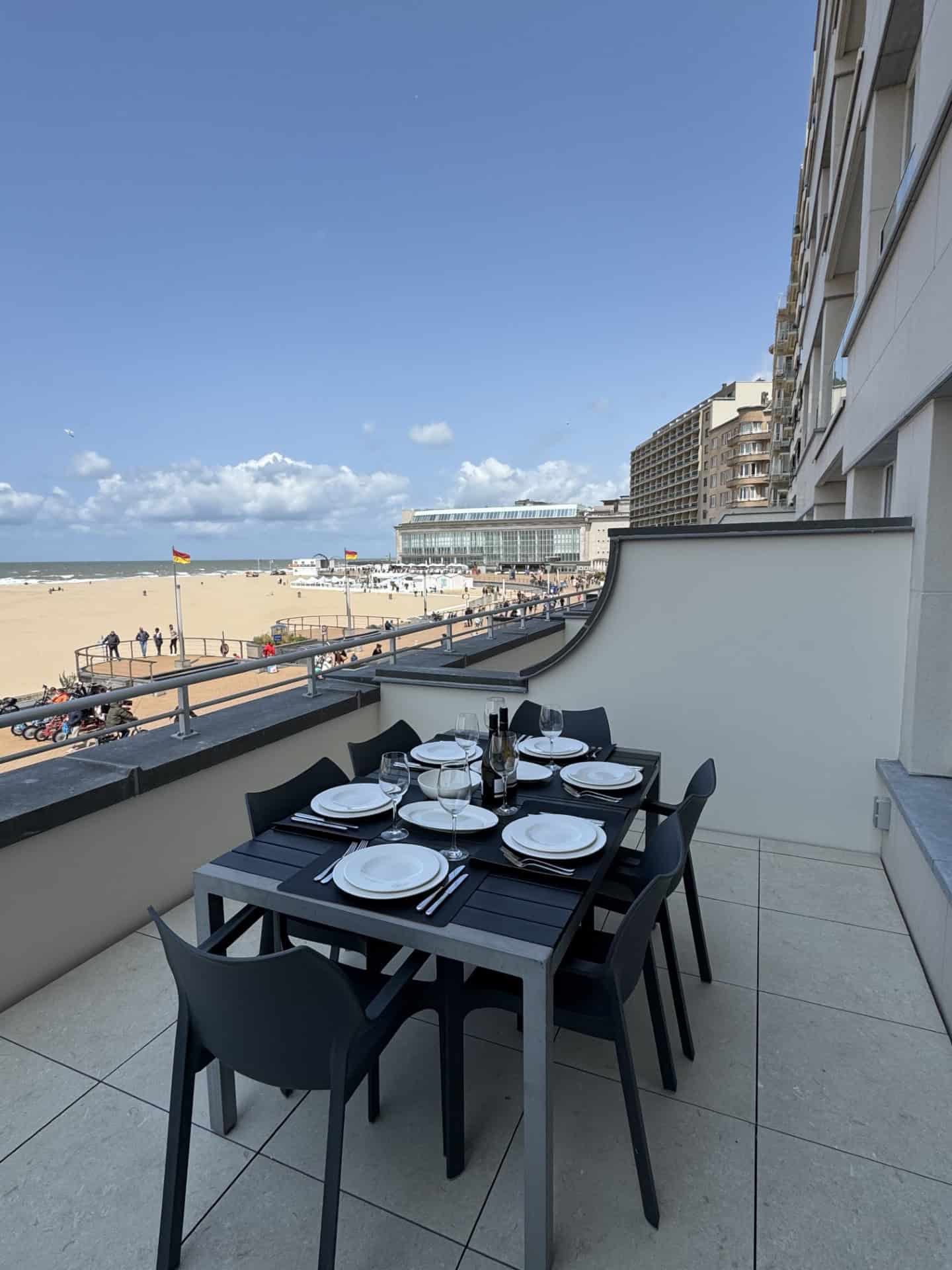 Vanaf het zeer ruime 17,5 meter groot terras hebben jullie een onovertroffen uitzicht op het Kursaal ,het strand, de zee en de Albert 1 Promenade ( Zeedijk ). Heerlijk met z’n allen eten en genieten op het grote terras op de 1-ste etage.